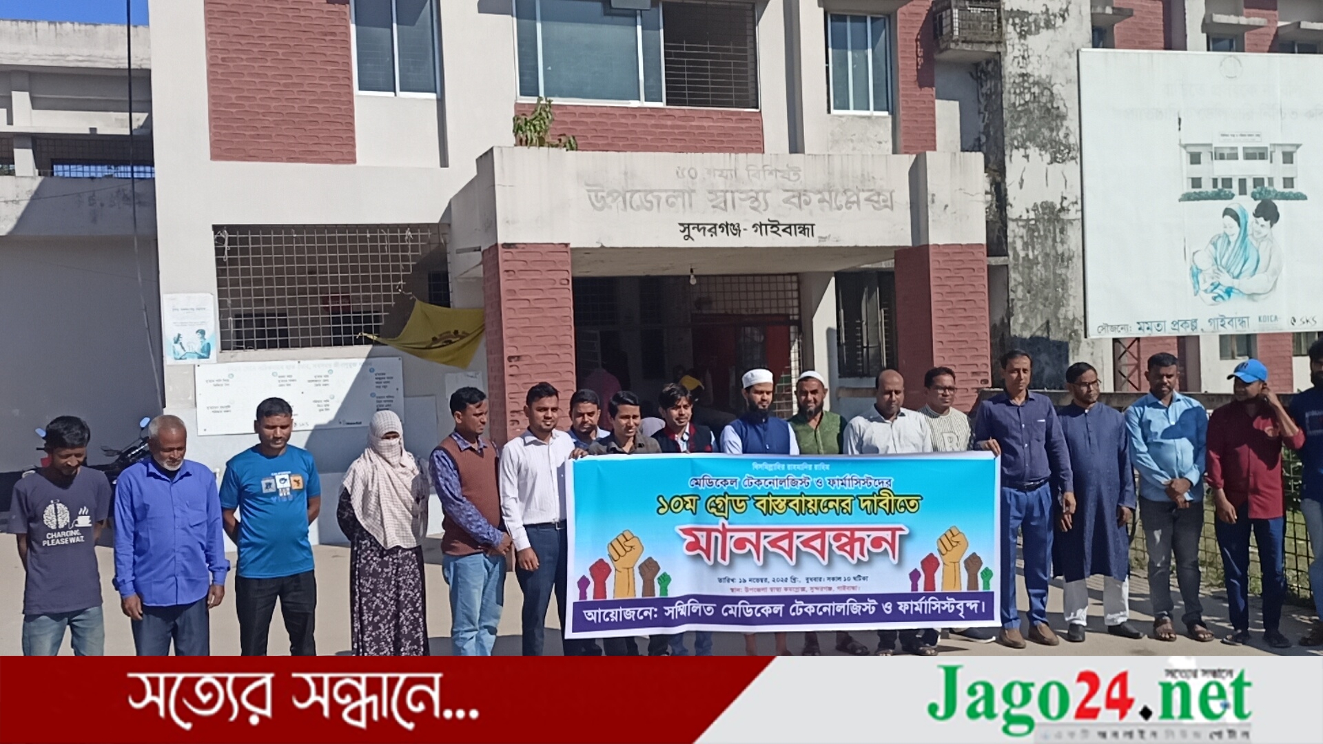 সরকারি হাসপাতালসমূহে কর্মরত মেডিকেল টেকনোলজিস্ট ও ফার্মাসিস্টদের পদমর্যাদা ১১তম গ্রেড থেকে ১০ম গ্রেডে উন্নীতকরণের দাবিতে গাইবান্ধার সুন্দরগঞ্জে মানববন্ধন অনুষ্ঠিত হয়েছে।