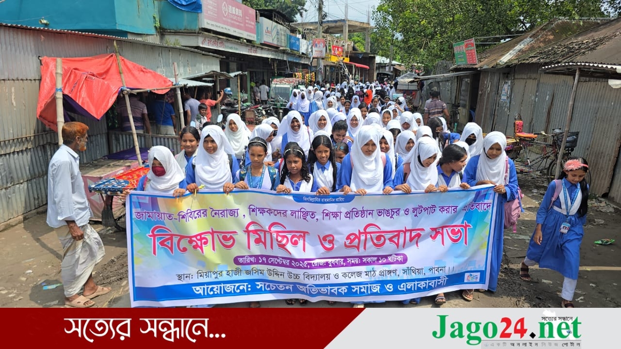 পাবনার সাঁথিয়ায় শিক্ষকদের লাঞ্ছিত ও শিক্ষাপ্রতিষ্ঠানে ভাঙচুরের প্রতিবাদে বিক্ষোভ মিছিল ও প্রতিবাদ সমাবেশ অনুষ্ঠিত হয়েছে। (বুধবার ১৭ সেপ্টেম্বর) সকাল ১১