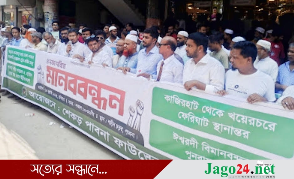পাবনা থেকে ঢাকায় সরাসরি ট্রেন সার্ভিস ও ঈশ্বরদীর বিমানবন্দর চালুসহ চার দফা দাবিতে মানববন্ধন করেছে পাবনাবাসী। এ সময় চারদফা দাবি
