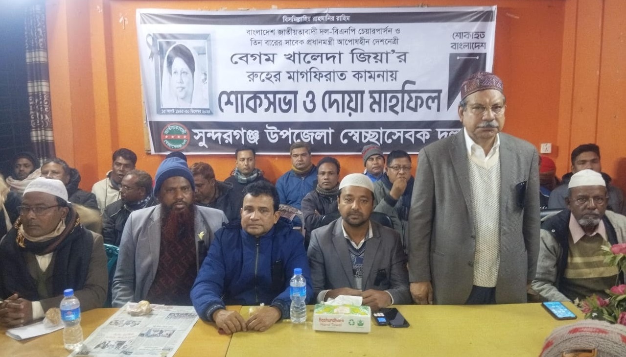 বিএনপির চেয়ারপার্সন বেগম খালেদা জিয়ার রুহের মাগফেরাত কামনা করে গাইবান্ধার সুন্দরগঞ্জে শোকসভা ও দোয়া মাহফিল অনুষ্ঠিত হয়েছে। শনিবার বাদ মাগরিব