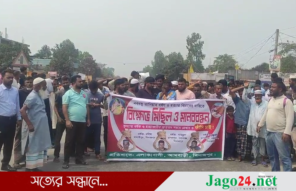 দিনাজপুরের চিরিরবন্দরে বাসর রাতেই নববধূ তানিয়াকে ধর্ষণ ও হত্যার দ্রুত বিচার এবং ওসির অপসারণের দাবীতে মহাসড়ক অবরোধ করে বিক্ষোভ ও