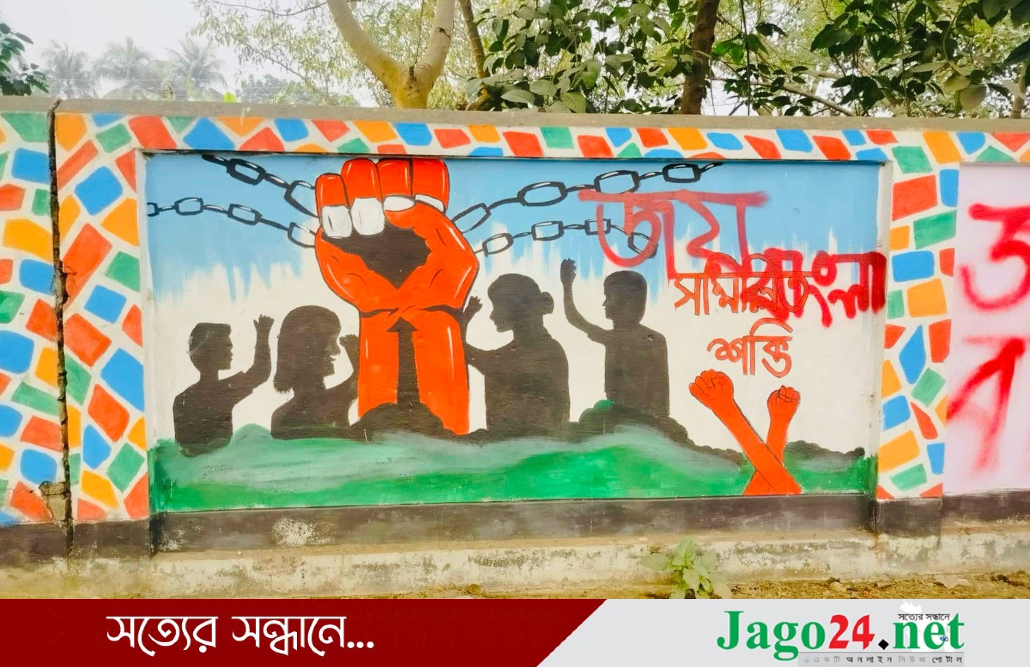 দিনাজপুরের চিরিরবন্দরে ফ্যাসিস্ট আওয়ামী সরকারের বিরুদ্ধে ছাত্র-জনতার জুলাই অভ্যুত্থানের স্মরণ নিয়ে দেয়ালে অঙ্কন করা গ্রাফিতির ওপর জয় বাংলা ও ছাত্রলীগ