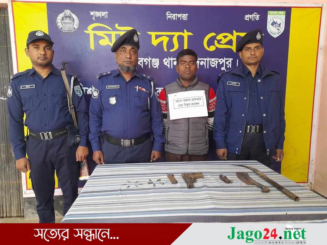 দিনাজপুর জেলার নবাবগঞ্জে বিদেশী নাইন এমএম পিস্তল, ১১ রাউন্ড গুলি,দেশীয় অস্ত্র এবং একটি খালি ম্যাগাজিনসহ এক যুবককে আটক করেছে যৌথ