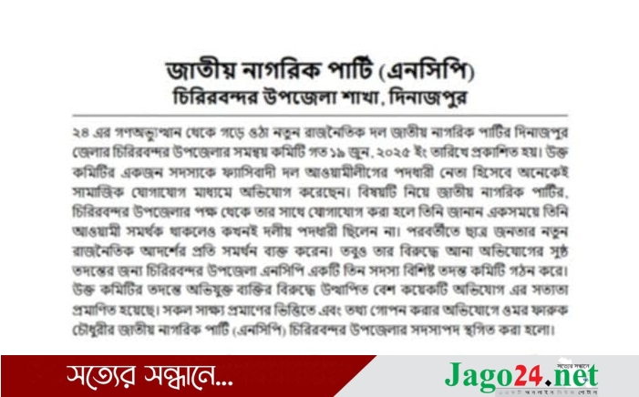 চিরিরবন্দরে এনসিপির সমন্বয় কমিটির যুবলীগ নেতার পদ স্থগিত