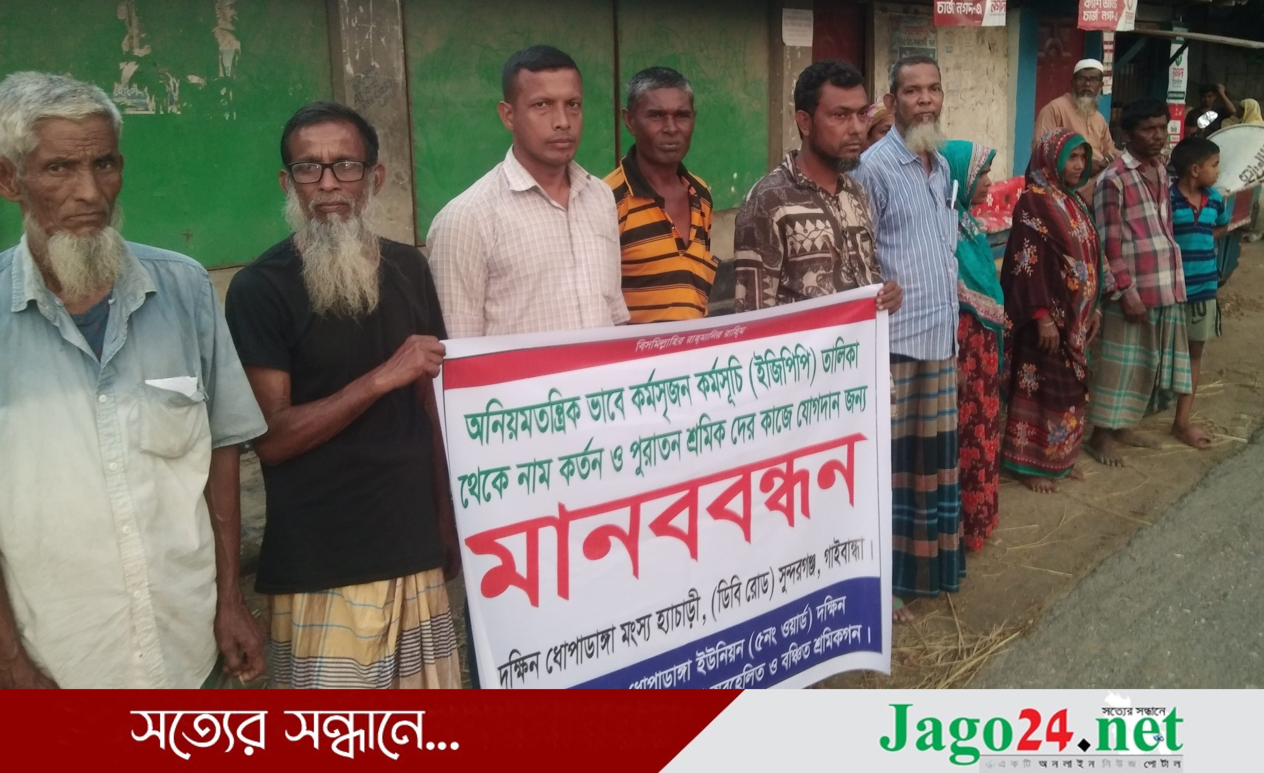 গাইবান্ধার সুন্দরগঞ্জে কর্মসৃজন কর্মসূচির (ইজিপিপি) তালিকা থেকে শ্রমিকদের নাম বাদ দেওয়া এবং অর্থ বাণিজ্যের অভিযোগে বঞ্চিত শ্রমিকরা মানববন্ধন করেছে। মঙ্গলবার