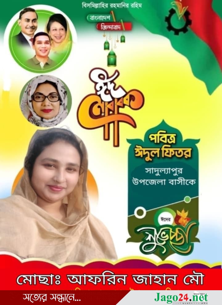 মাসব্যাপী সিয়াম পালনের পর পবিত্র ঈদ-উল ফিতর মুসলমানদের জীবনে শান্তি ও আনন্দের বার্তা বয়ে আসুক। ধনী-গরীব সব শ্রেণির মুসলমানদের মধ্যে নিবিড় ভাতৃত্ববোধ জাগ্রত হোক। মহান আল্লাহর আশীর্বাদে মুসলিম জীবনে সুখ, সমৃদ্ধি ও আনন্দ নিয়ে সমৃদ্ধির সঙ্গে ভরে দিক। পবিত্র ঈদ-উল ফিতর উপলক্ষে সাদুল্লাপুর উপজেলাবাসীসহ বিএনপির সকল অঙ্গসংগঠনের নেতাকর্মীদের প্রতি আন্তরিক শুভেচ্ছা ও ঈদ মোবারক।