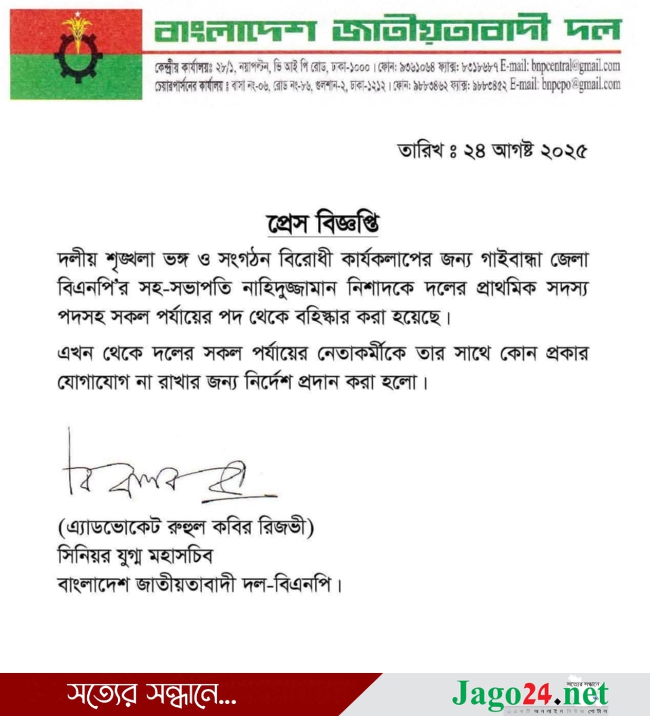 দলীয় শৃঙ্খলা ভঙ্গ ও সংগঠন বিরোধী কার্যকলাপের জন্য গাইবান্ধা জেলা বিএনপি’র সহ-সভাপতি নাহিদুজ্জামান নিশাদকে দলীয় সকল পদ থেকে বহিস্কার করা হয়েছে।