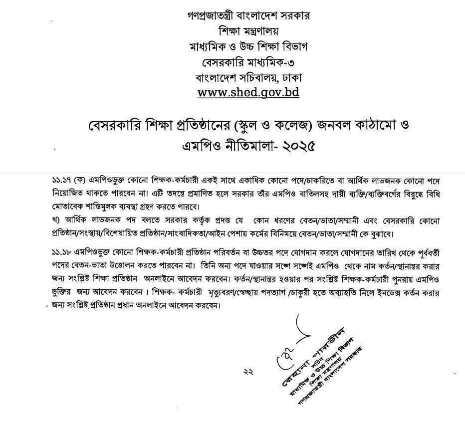 রোববার (৭ ডিসেম্বর) বেসরকারি শিক্ষাপ্রতিষ্ঠানের (স্কুল ও কলেজ) জনবল কাঠামো ও এমপিও নীতিমালায় এ নির্দেশনা দেওয়া হয়।