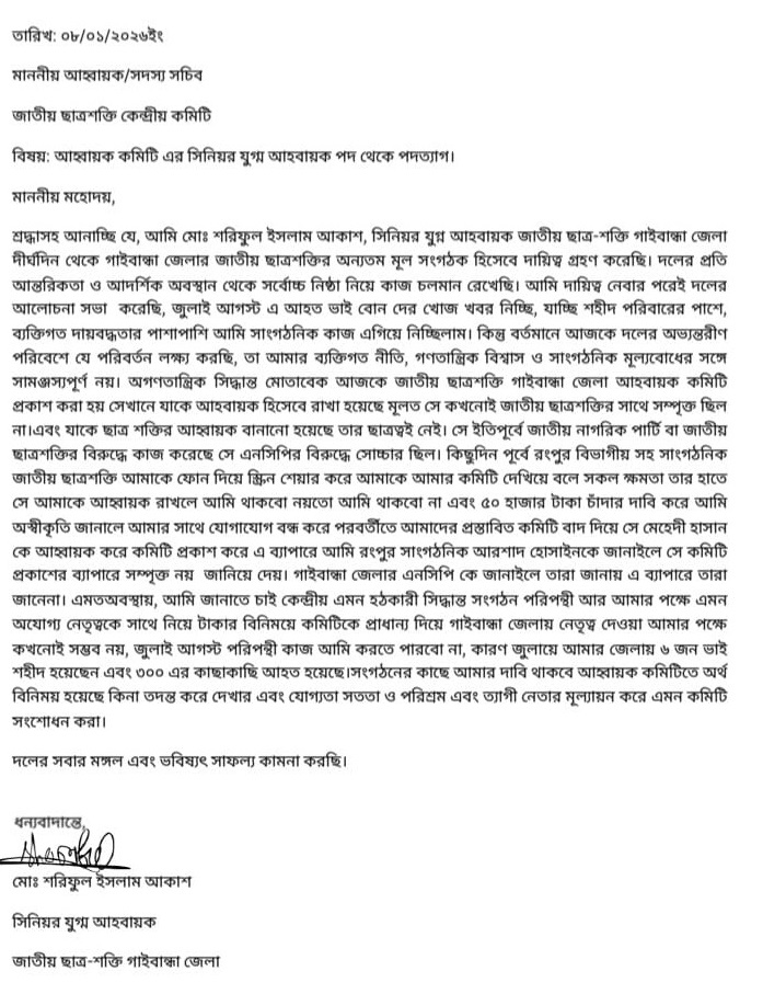 অগণতান্ত্রিক সিদ্ধান্ত মোতাবেক ইতোমধ্যে জাতীয় ছাত্রশক্তি গাইবান্ধা জেলা আহবায়ক কমিটি প্রকাশ করা হয়। সেখানে যাকে আহবায়ক হিসেবে রাখা হয়েছে, মূলত: তিনি কখনই জাতীয় ছাত্রশক্তির সাথে সম্পৃক্ত ছিলেন না। এবং তার ছাত্রত্বই নেই। এছাড়া আরও অনেক কারন উল্লেখ করা হয় পদত্যাগপত্রে।